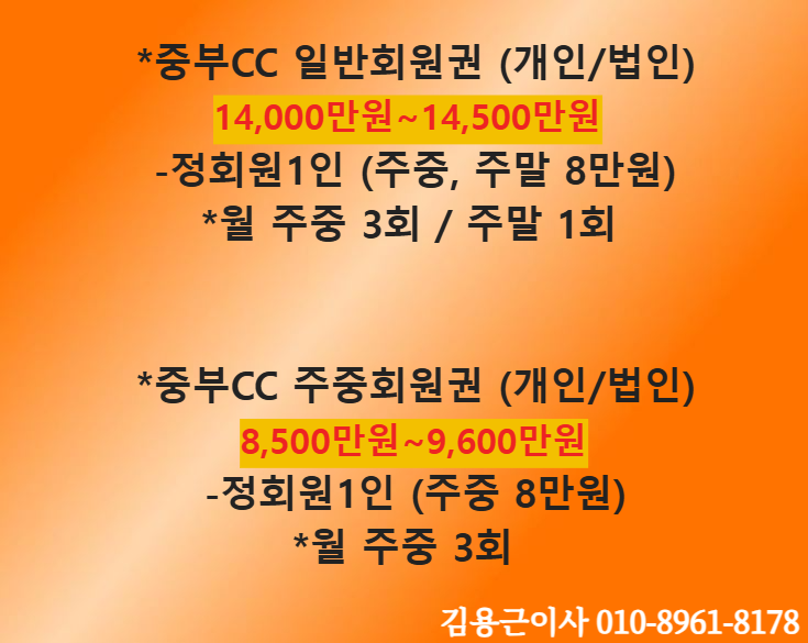 *중부CC 법인회원권은 개인 법인간 교차 매매가 가능하여 개인한구좌를 구입하시면 법인반구좌 입회가 가능합니다. (개인,법인시세 동일)